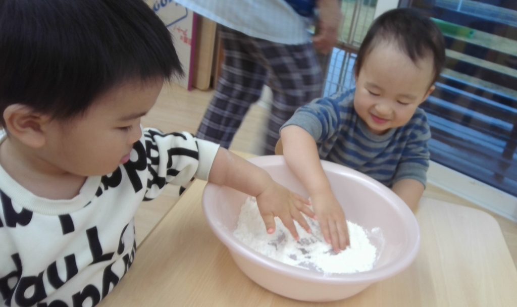 ぶどう組・もも組で初めての小麦粉粘土をしたよ(^^♪初めて見る小麦粉に興味深々な子どもたち。小麦粉から粘土になっていく様子を真剣な表情で見ていました☆
