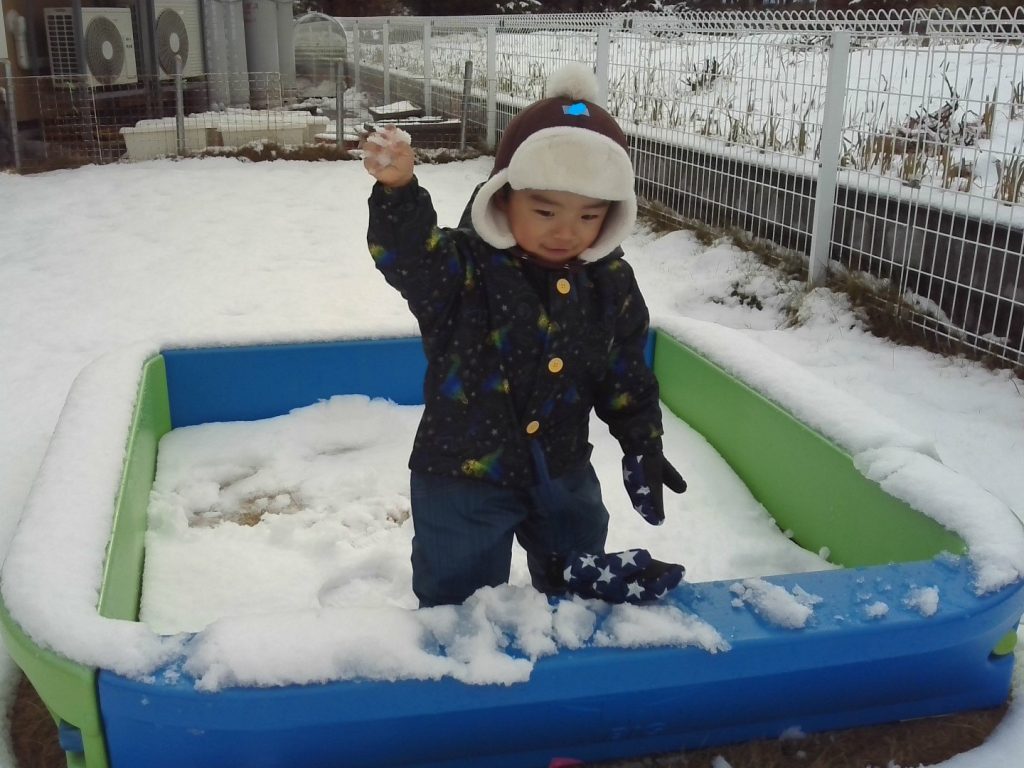 さくらんぼちびっ子保育園の園庭にも雪が積もりました♪さっそく保護者の方に用意していただいた、スノーウエアを着て雪遊びへ行ってきましたよ(*^▽^*)