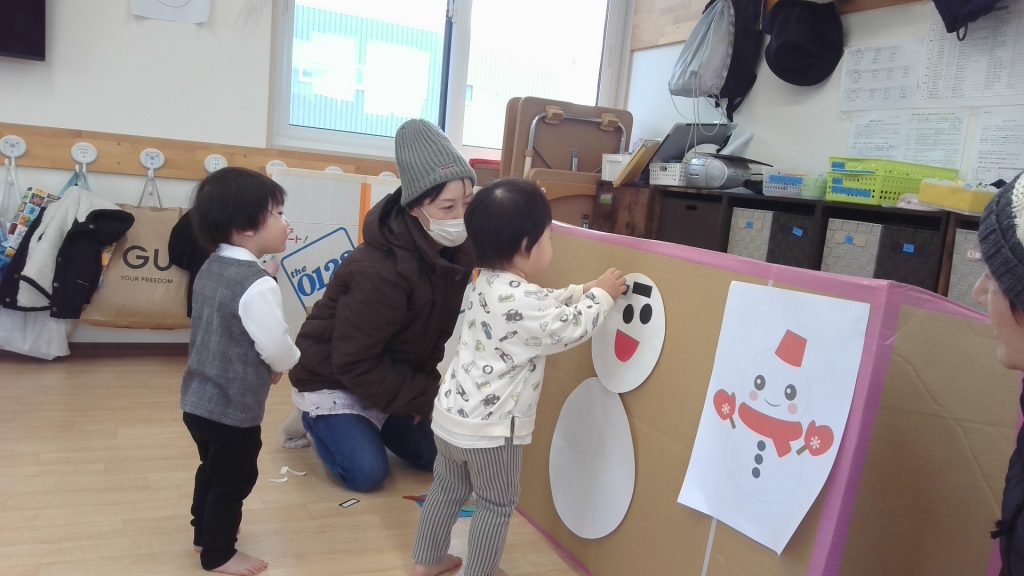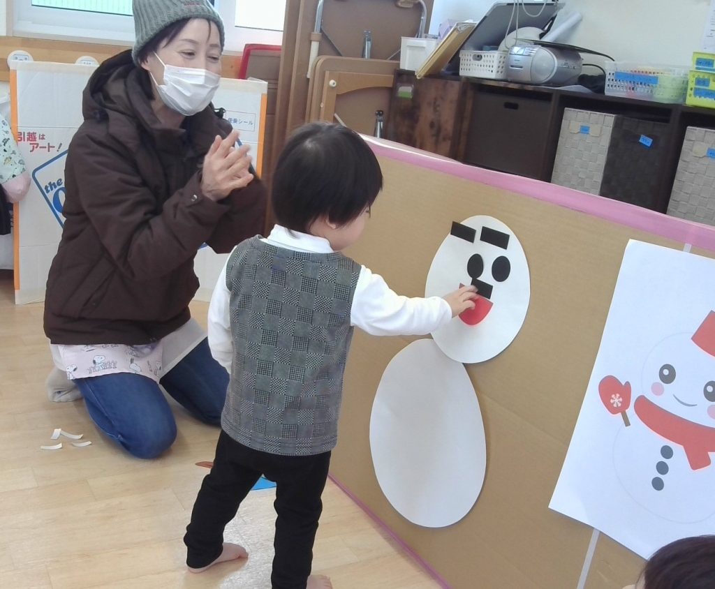 雪だるまの顔に目・眉毛を付けてくれたRちゃん。ニコニコの雪だるまさんになりました(o^―^o)ニコ