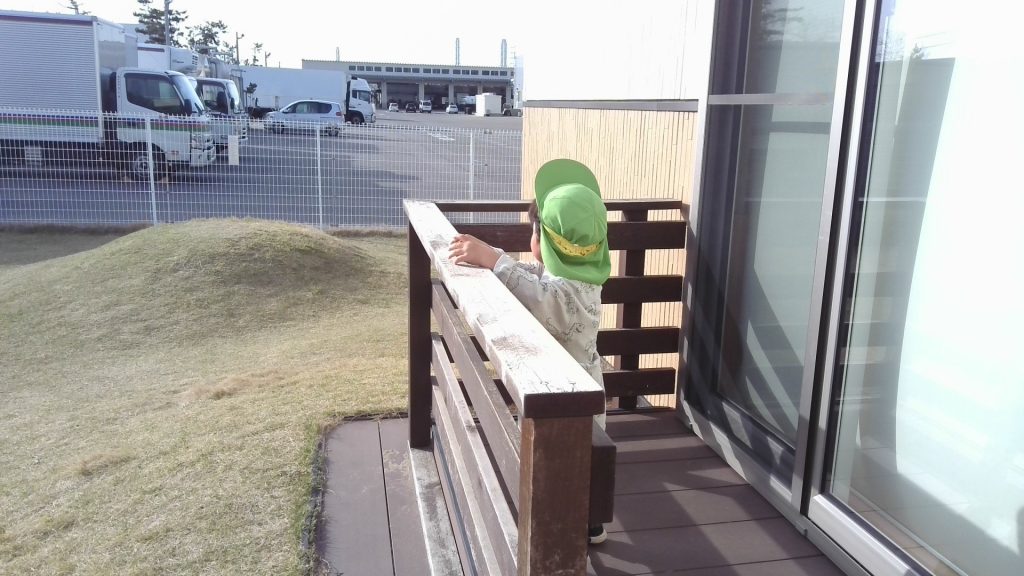 滑り台から保育室のベランダに移動したM君。手すりの上に2個の松ぼっくりを並べて何やらブツブツ…よ~く聞くと「はい!どうぞ~」と・・