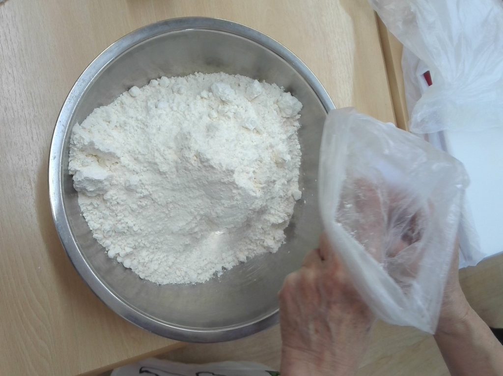 強力粉・薄力粉・ベーキングパウダー・・を混ぜます。
