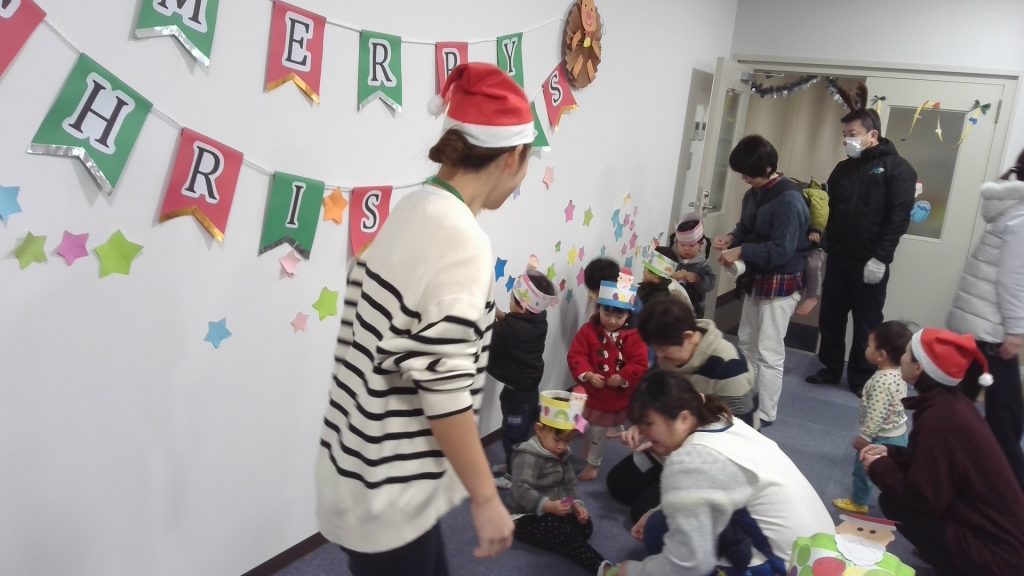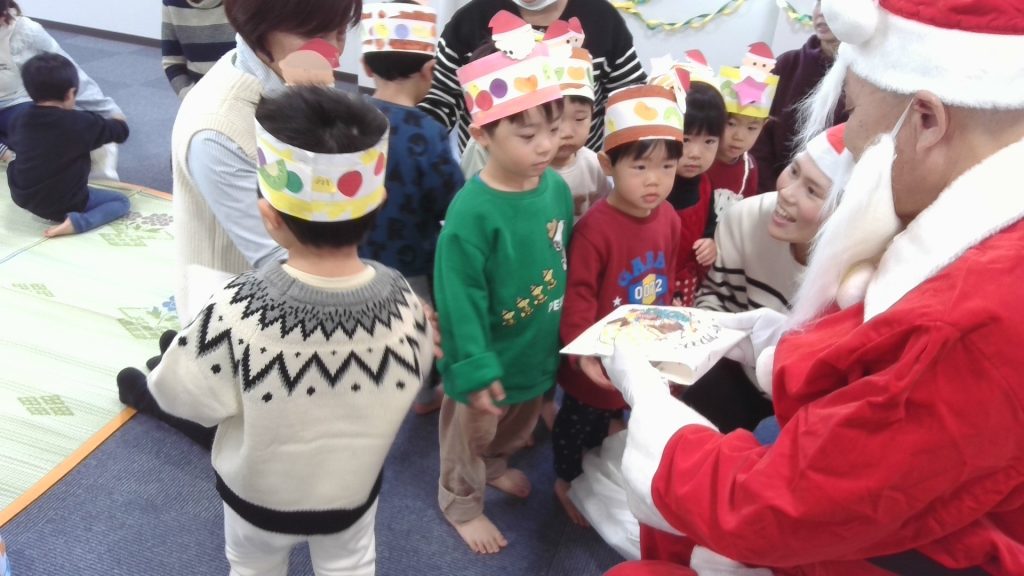 子ども達にサンタさんからプレゼント!! サンタさんから一人ひとり受け取りとり…大喜びの子ども達です!!