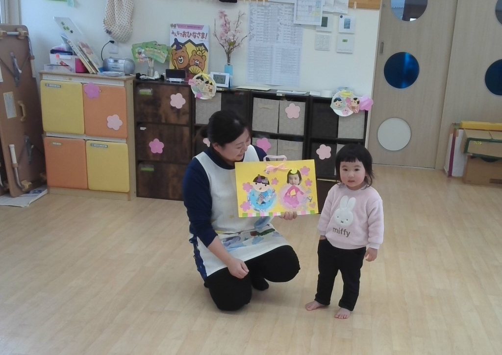 3月3日、ひな祭り🎎 ももの節句とも言いますね!! 保育園でも、子ども達が元気にすくすく育ちますように・・・と願いを込めてひな祭りをしました(o^―^o)ニコ